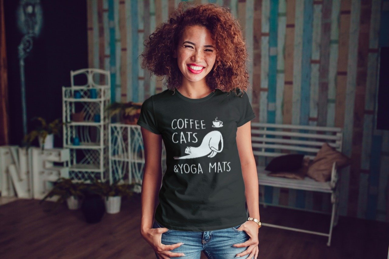 Women’s Printed Round Neck Half Sleeve T-Shirt | Coffee, Cats and Yoga Mats